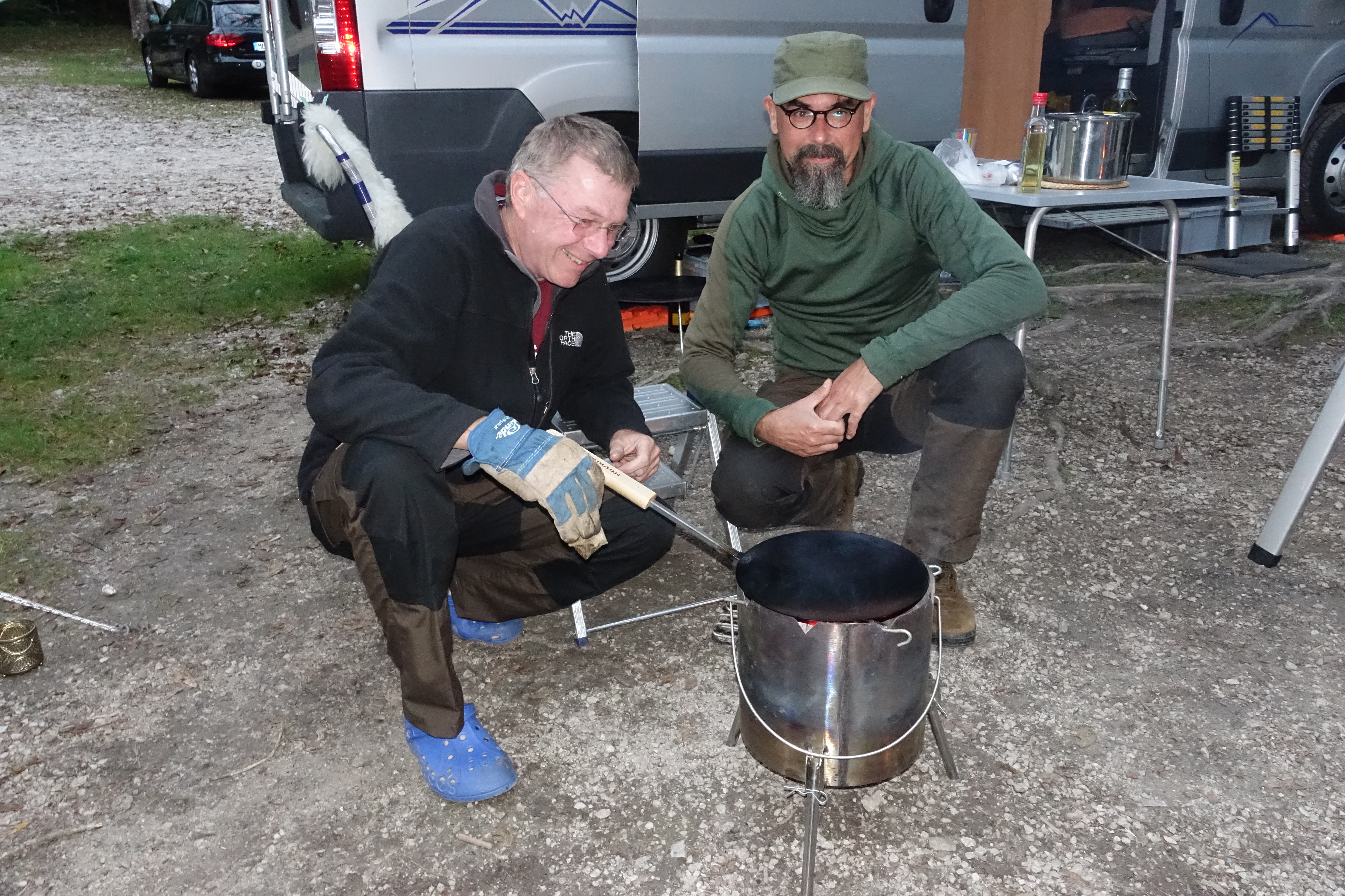 Das Wetter war weiterhin super. Absolut windstill und perfekt für einen weiteren gemütlichen Abend: Lagerfeuer, Muurika (von Wolfgang W.) einbrennen, ein weiteres kleineres Lagerfeuer, Marshmellows, Akazienlikör, Bier, Kekse, super Kuchen von Birgit und Katja, noch ein Potjie King Lagerfeuer, Radler, Naschzeug, flüssige Kräuter und und und… Und das wichtigste: schwachsimpeln.