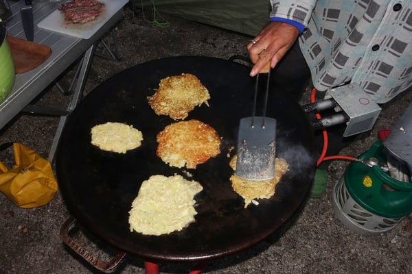 Fürs AOCooking hatten Marianne und Mario ihre Kartoffelreibe mitgebracht. Eifrig wurden Kartoffeln geschält und gerieben um später auf mehreren Muurikas Reiberdatschis zu brutzeln. Die Menge hätte wahrscheinlich für eine Atlantiküberquerung gereicht. Woif kochte auf der großen Muuri ein ausgezeichnetes Curry als Vorspeise.